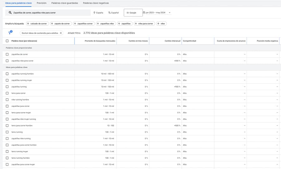Aunque está diseñada para campañas de Google Ads, te puede resultar muy útil para SEO. Podrás encontrar palabras clave relevantes y ver sus volúmenes de búsqueda