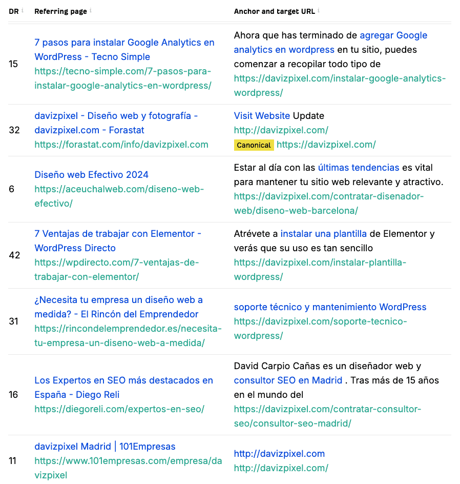- Construcción de Enlaces: Ayudar en la identificación y gestión de backlinks (enlaces entrantes), que son cruciales para mejorar la autoridad y el ranking de tu sitio.
