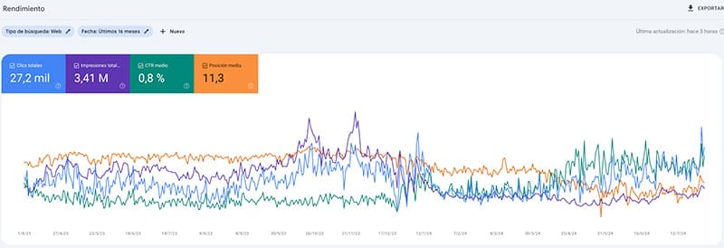 Te proporciona información sobre el rendimiento de tu sitio en los resultados de búsqueda de Google, incluyendo clics, impresiones, posición media y más.