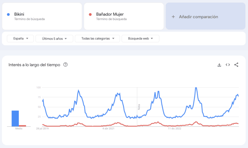 Por ejemplo, puedes saber si una keyword es más o menos estacional o si la keyword que te interesa genera más o menos peticiones de búsqueda a lo largo del tiempo.