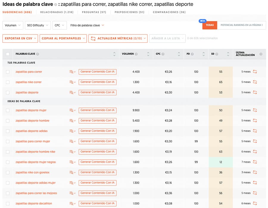 Te ofrece datos sobre el volumen de búsqueda, la dificultad de la palabra clave y sugerencias de palabras clave relacionadas.